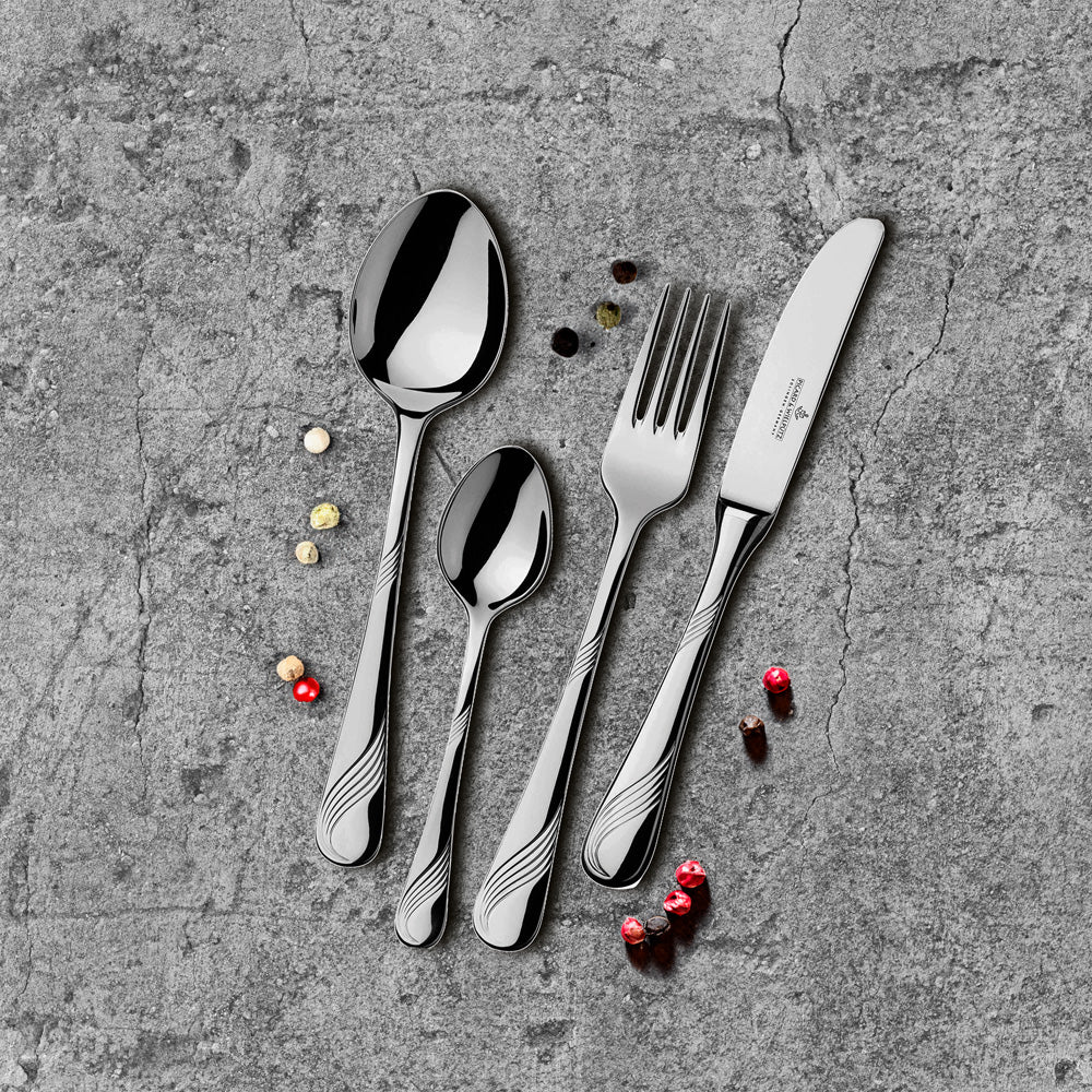 Die feinen Linien im Dekor wirken wie ein Band, welches das Besteck umschlingt und bilden den Blickfang des Bestecks, welches den gedeckten TIsch edel und elegant aussehen lässt. Das Solinger Familienunternehmen Picard & Wielpütz bietet Besteck Made in Germany an. Bei Picard & Wielpütz findet ein Zusammenspiel zwischen Handarbeit und maschineller Fertigung statt, sodass jederzeit die bestmögliche Qualität gewährleistet wird.