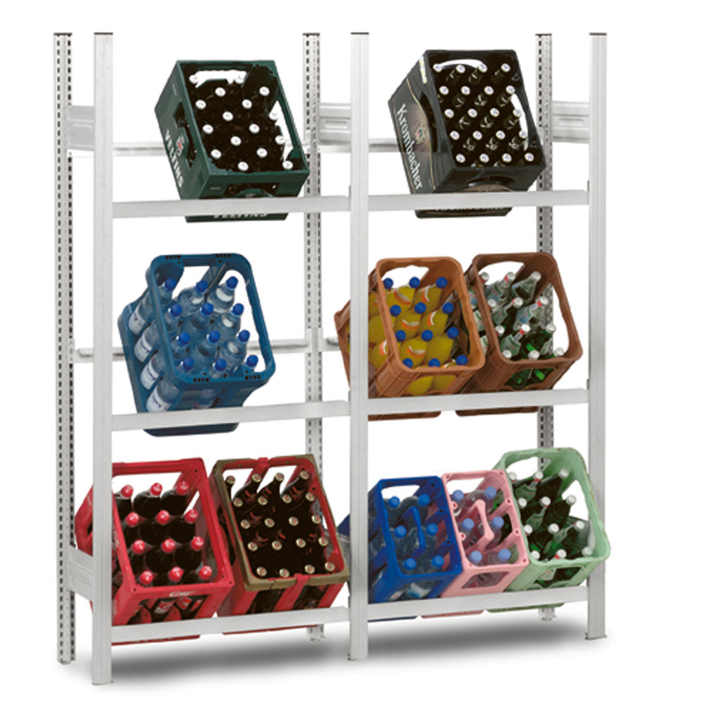Robuste Spezialregale zur Lagerung von Getränkekisten auf 3 Ebenen. Komplett aus verzinktem Stahl, korrosionsbeständig und sehr stabil. Linearer Ausbau möglich: An ein Grundregal können beliebig viele Anbauregale unterschiedlicher Breite eingehängt werden. Fachlast bis zu 100 kg, Feldlast bis zu 300 kg. Lieferung erfolgt zerlegt - einfache Montage. 5 Jahre Garantie!