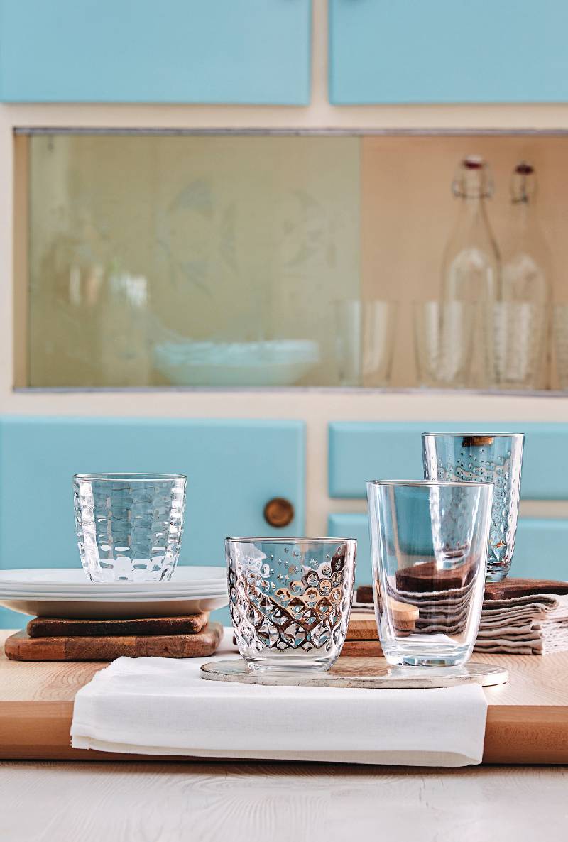 Die Gläser der Serie GLIT sind besonders schöne Exemplare, die jedes Tischgedeck aufwerten. Die unterschiedlich großen Rauten im Muster bieten eine rutschsichere Haptik und sorgen gleichzeitig für einen Glitzer-Effekt.