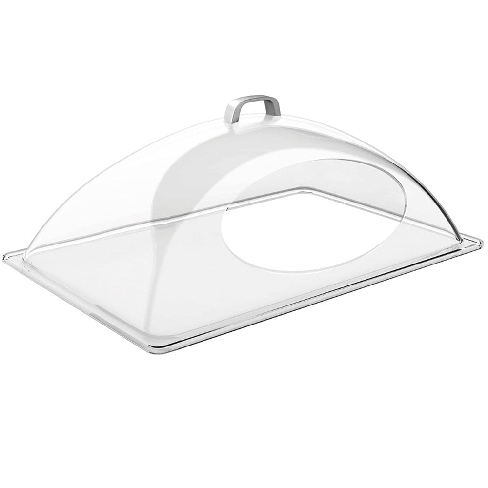 Gerundete Haubendeckel aus glasklarem ABS-Kunststoff mit einem verchromtem Griff, stapelbar und spülmaschinenfest mit Ausnahme der Griffe. Passend für alle Tabletts und Behälter in der Gastronorm.