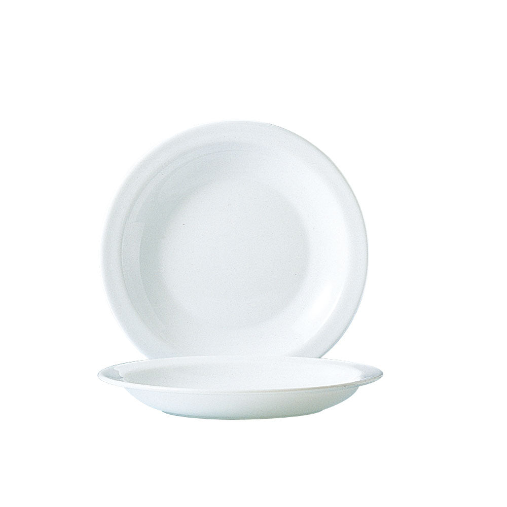 Reinweißer tiefer Teller aus Opalglas mit einem Durchmesser von 22,5 cm in Coupform. Die Opalglasserie Hotelierie aus dem Hause Arcoroc ist für die Großverpflegung gedacht und bietet ein breites Sortiment stapelbarer Systemteile aus reinweißem Opalglas.
