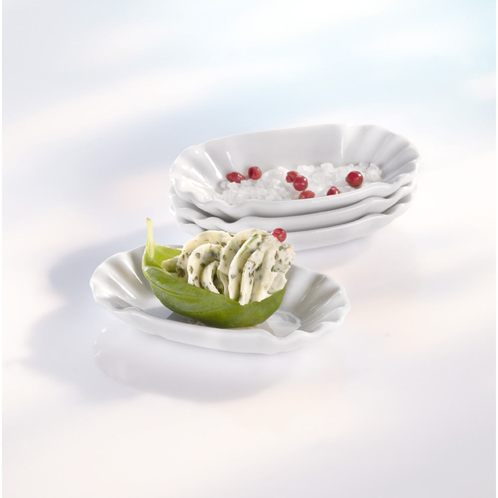 Die originellen Portionsschalen für Fingerfood & Co, dazu eine Minischale für Dips. Stapelbares, mikrowellen- und spülmaschinenfestes Hartporzellan in Reinweiß.