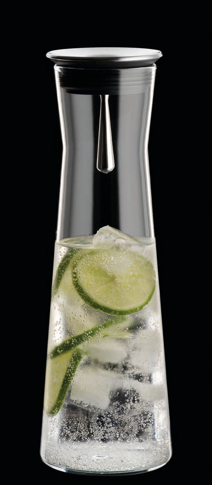 Zeitlose Karaffe aus hitzebeständigem Borosilikatglas mit praktischem Ausgießer mit Verschlusstechnik aus rostfreiem Metall und Kunststoff, inklusive Deckel mit Silikondichtung. Für kalte und heiße Getränke geeignet.