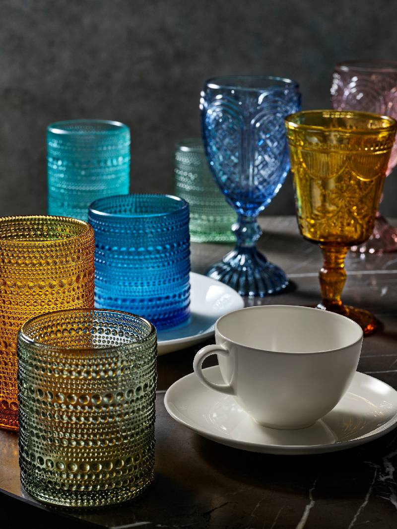 Stabile Gläser mit einer umlaufenden Verzierung, die an Glasperlen erinnert. Dieses einzigartige Design setzt jedes Getränk kunstvoll in Szene.