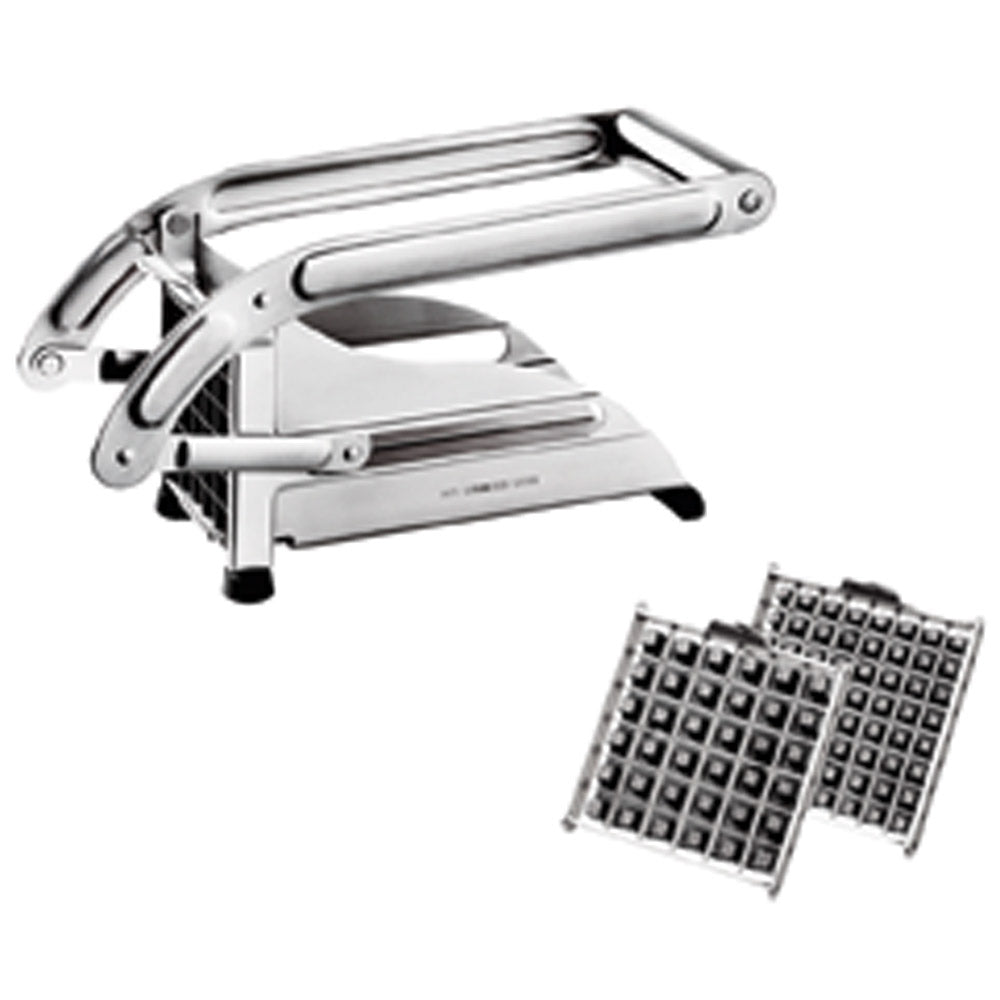Semiprofessioneller Kartoffel- oder Gemüseschneider zur Herstellung von z.B. Pommes Frites mit wechselbaren Klingen (9 x 9 und 12 x 12 mm). Stabiler Korpus aus rostfreiem Edelstahl mit rutschfesten Füssen.Größe 26 x 9 x 12,5 cm.