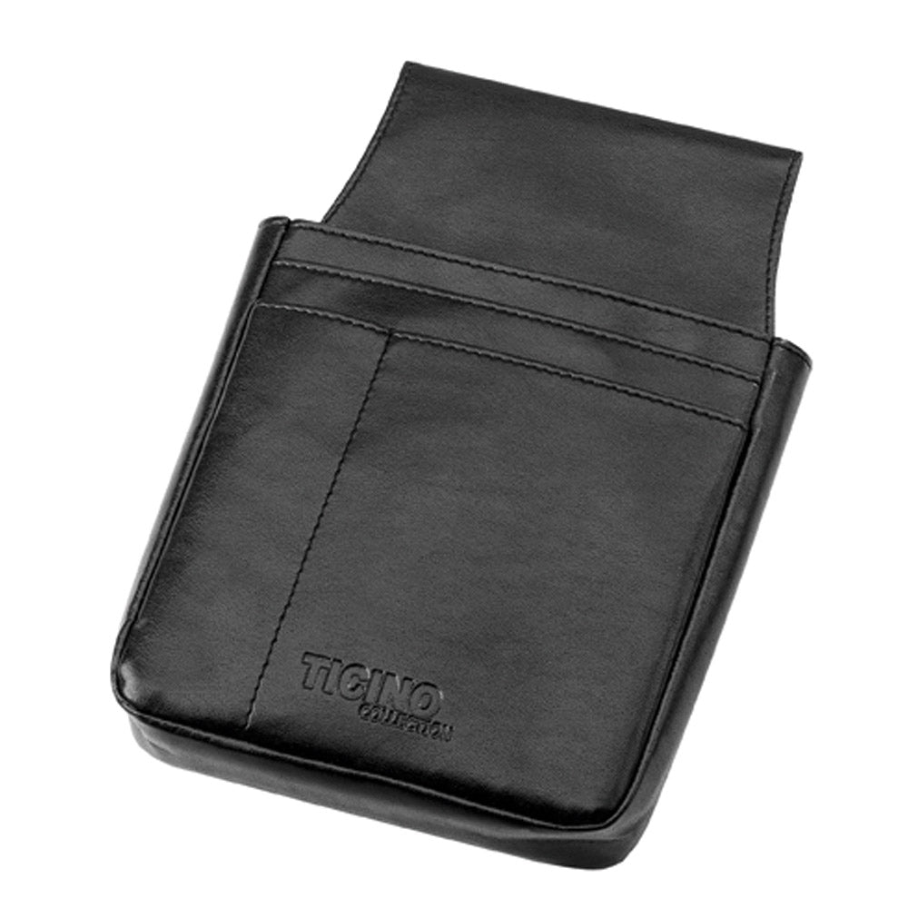 Praktische Halftertasche aus schwarzem PU-Kunstleder. Mit drei Steckfächern für Kellnerbörse und Notizblock, sowie einem Kugelschreiberfach. Geeignet für Gürtel bis max. 7 cm Breite. Größe 14,5 x 23 cm.