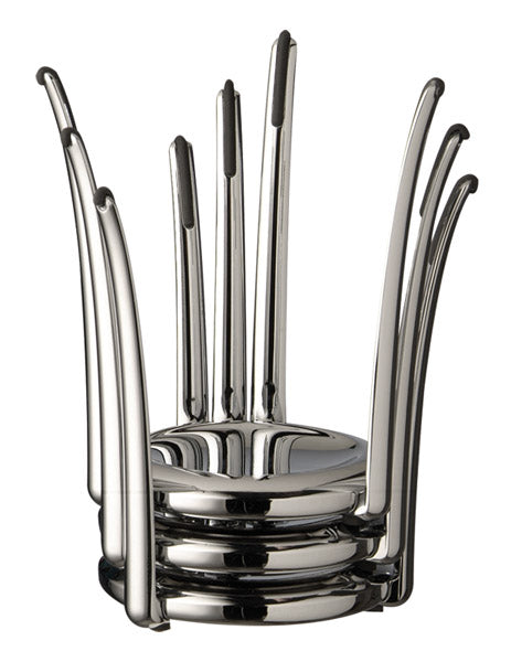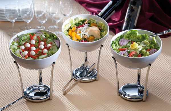Hochwertige Buffetständer für Schüsseln, Schalen und Platten. Kein Verrutschen, Arme und Beine sind mit rutschfesten Einsätzen versehen. Schwere, standsichere Qualität aus verchromtem Metall. Stapelbare Form, Ø 15 cm. Der Fuß kann auch als Ablagefläche für Vorlegeteile dienen.