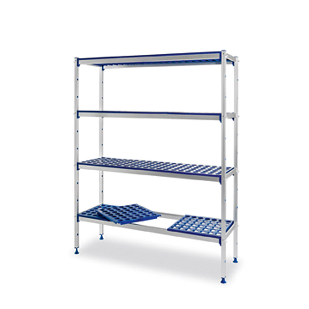 Kühlhausregal aus eloxiertem Aluminium mitEinlegeböden aus spülmaschinenfestem PP-Kunststoff. Alle Füße mit Niveauregulierung, Traglast bis 150 kg pro Boden (gleichmäßig verteilt), Feldlast pro Regal bis zu max. 600 kg. Temperaturbeständig bis -20° C. Lieferungerfolgt zerlegt - einfache Montage ohne Werkzeuge.Größe 128 x 40,5 x 168,5 cm.
