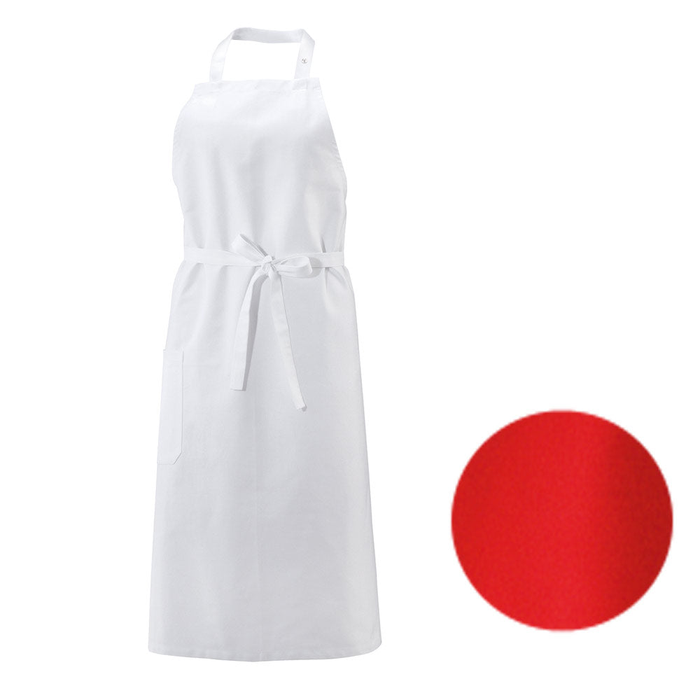 Die rote Latzschürze hat die Größe 80 x 100 cm. Sie besteht aus Mischgewebe, welches sich aus 65% Baumwolle und 35% Polyester zusammensetzt. Aus diesem Grund sind die Textilien bis zu 60° C waschbar ohne ihre Leuchtkraft zu verlieren. Das Material hat ein Gewicht von 220 g/m2 und entspricht dem Öko-Tex Standard 100. Bei der Herstellung werden nur farbechte Stoffe verwendet. Sie verfügen über ein verstellbares Nackenband und eine große Seitentasche rechts.