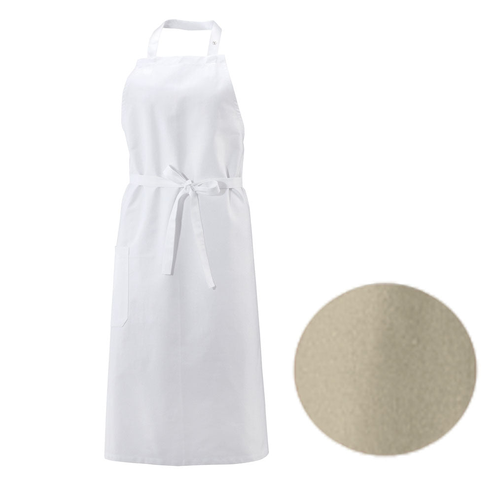 Die sandfarbene Latzschürze hat die Größe 80 x 100 cm. Sie besteht aus Mischgewebe, welches sich aus 65% Baumwolle und 35% Polyester zusammensetzt. Aus diesem Grund sind die Textilien bis zu 60° C waschbar ohne ihre Leuchtkraft zu verlieren. Das Material hat ein Gewicht von 220 g/m2 und entspricht dem Öko-Tex Standard 100. Bei der Herstellung werden nur farbechte Stoffe verwendet. Sie verfügen über ein verstellbares Nackenband und eine große Seitentasche rechts.