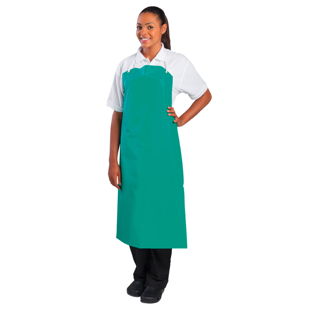 Verstärkte Latzschürze aus 100% grünem Polyamid mit Messingösen. Lieferung inkl. drei losen Bändern (Länge 60 cm). Gesamtgröße 105 x 90 cm.