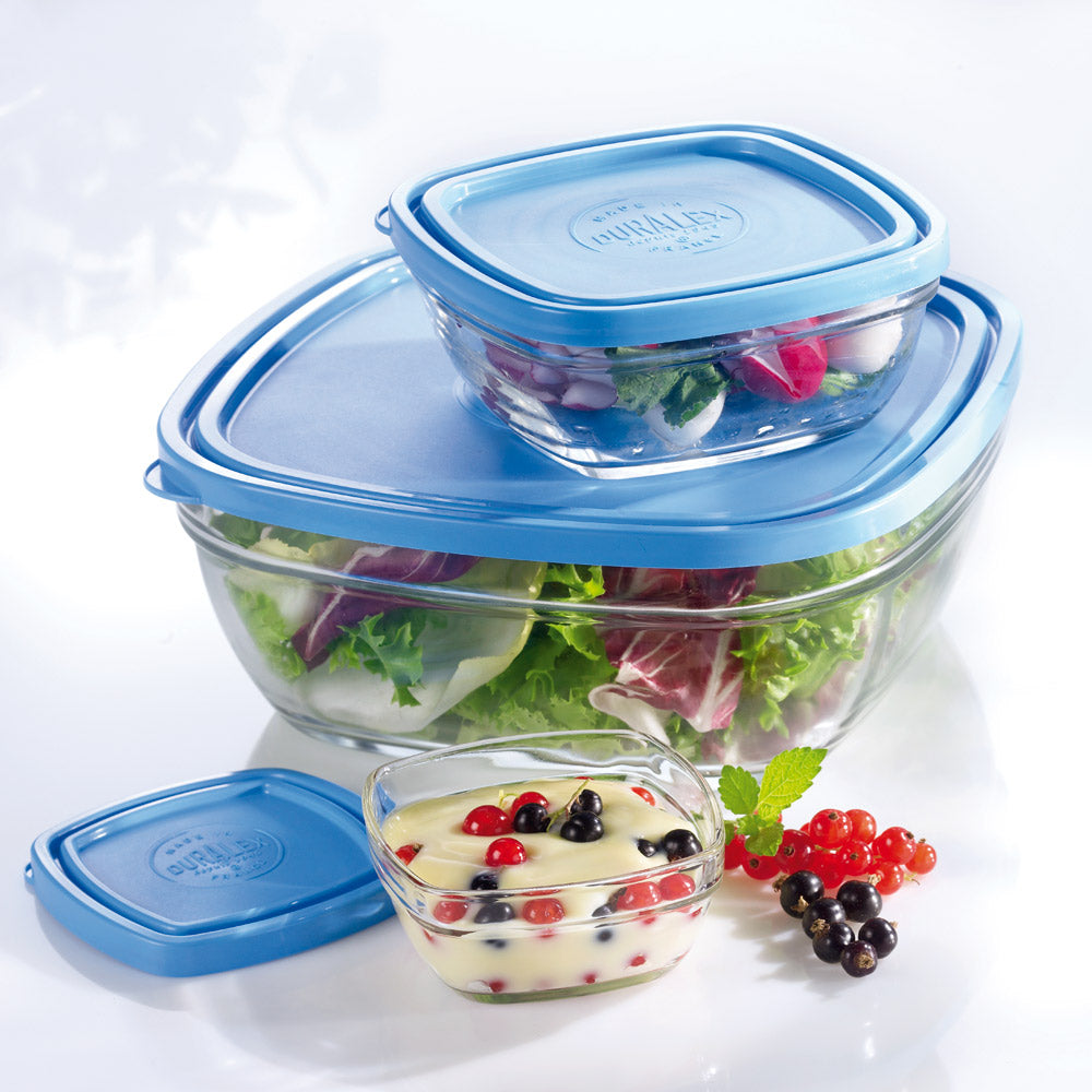 Universell einsetzbare Schüsseln aus gehärtetem Glas. Spülmaschinen- und mikrowellenfest. Für alle Größen sind passende Deckel aus blauem PE-Kunststoff lieferbar. Temperaturbeständig von -40° bis +95° C, ebenfalls spülmaschinen- und mikrowellenfest.