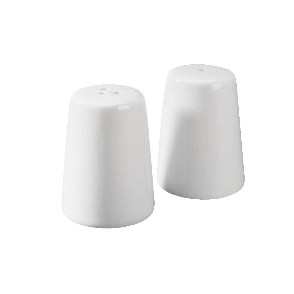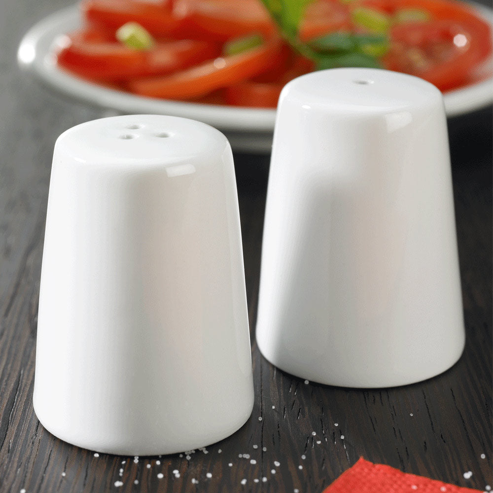 2-teiliges Set, bestehend aus Salz- und Pfefferstreuer. Kleine, konische Form aus hochweißem, spülmaschinenfestem Hartporzellan mit Kunststoffverschlüssen. Inhalt 25 ml - Ø 3,5 x 5 cm.