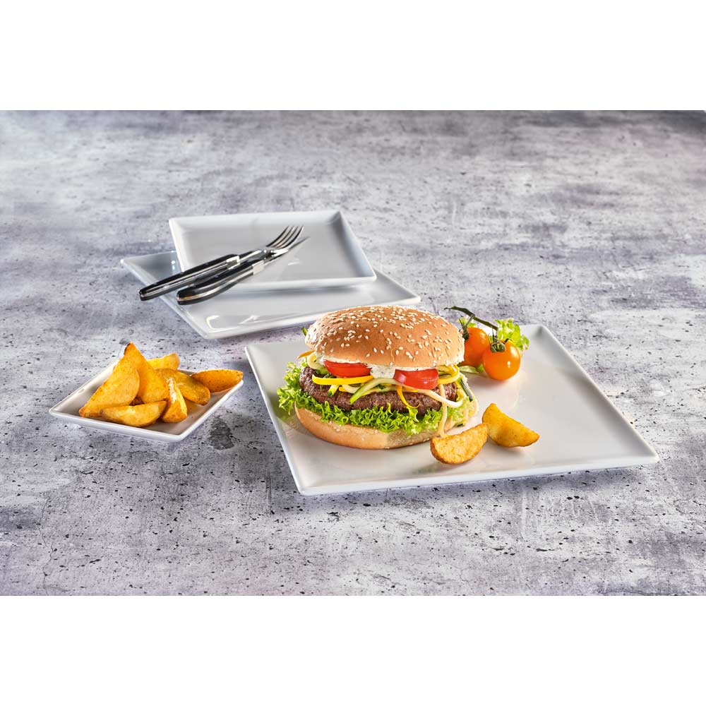 Quadtratische Tellerserie in ansprechendem Design. Flexibler Einsatz dank unterschiedlicher Größen - somit auch als Plattenserie zu verwenden! Aus qualitativem Hartporzellan, spülmaschinen- und mikrowellenfest sowie stapelbar.