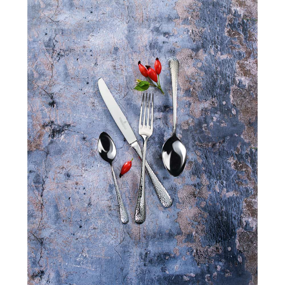 Der Dessertlöffel hat eine Größe von 18,4 cm und bietet sich für Puddingspeisen oder Eis an. Die exklusive Besteckserie Mia begeistert durch ihre Handschmiedeoptik. Das Material besteht aus rostfreiem Chromnickelstahl 18/10 mit einer Materialstärke von 3,5 mm und ist spülmaschinengeeignet. Die Oberteile sind hochglanzpoliert. Das Gewicht des Tafelmessers dieser Serie beträgt 118 g. Für lange Freude an dem Besteck geben wir Ihnen 5 Jahre Nachkaufgarantie.