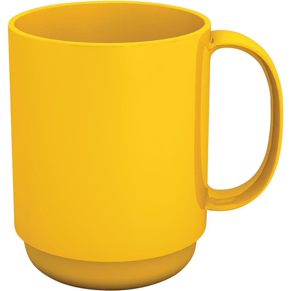 Klassischer Henkelbecher aus PP-Kunststoff, stapelbar, mikrowellen- und spülmaschinenfest. Der Becher ist in der Praxis sehr beliebt, da er besonders standfest ist und der große Henkel eine optimale und sichere Handhabung gewährleistet. Zudem ist er, genau wie die klassische Tasse 501, aufgrund seines speziellen Stapelrandes besonders einfach und gut stapelbar. Inhalt 350 ml - Ø 7,9 x 10,2 cm. Lieferzeit ca. 1 Woche.