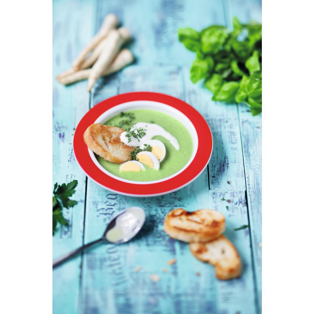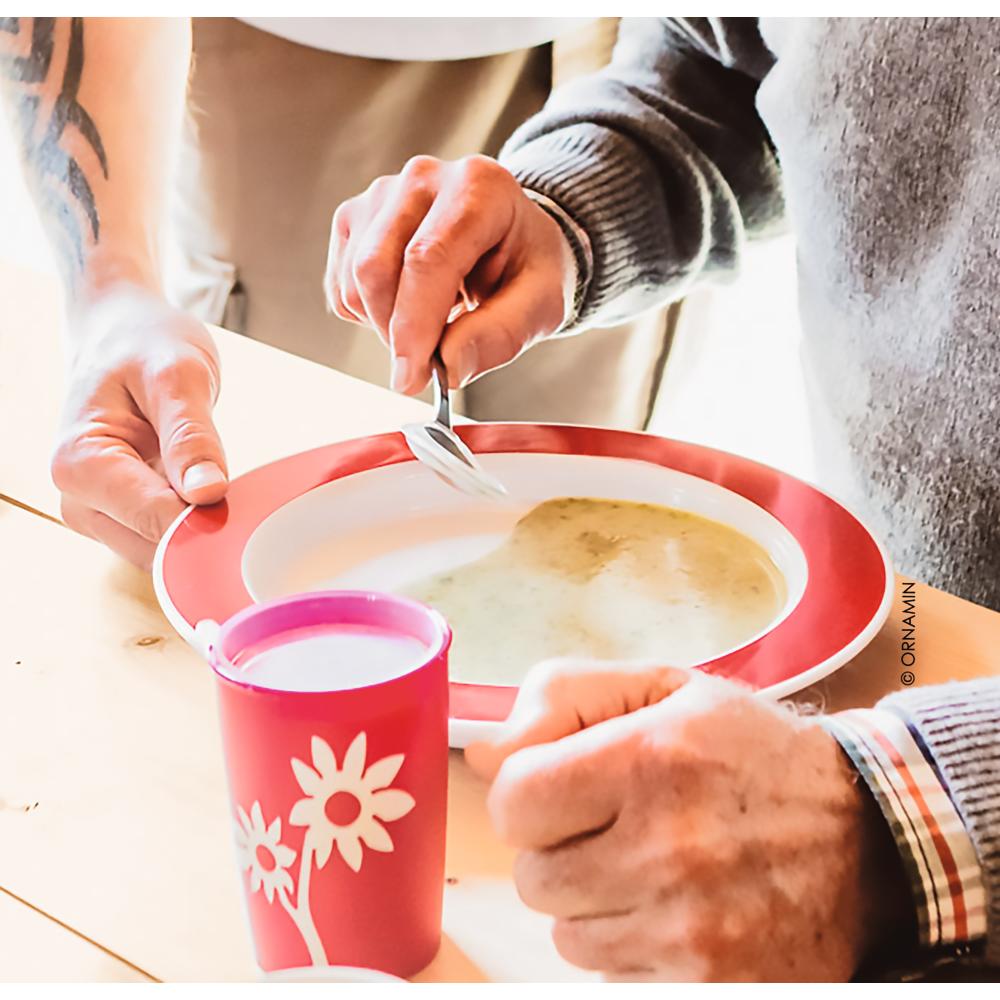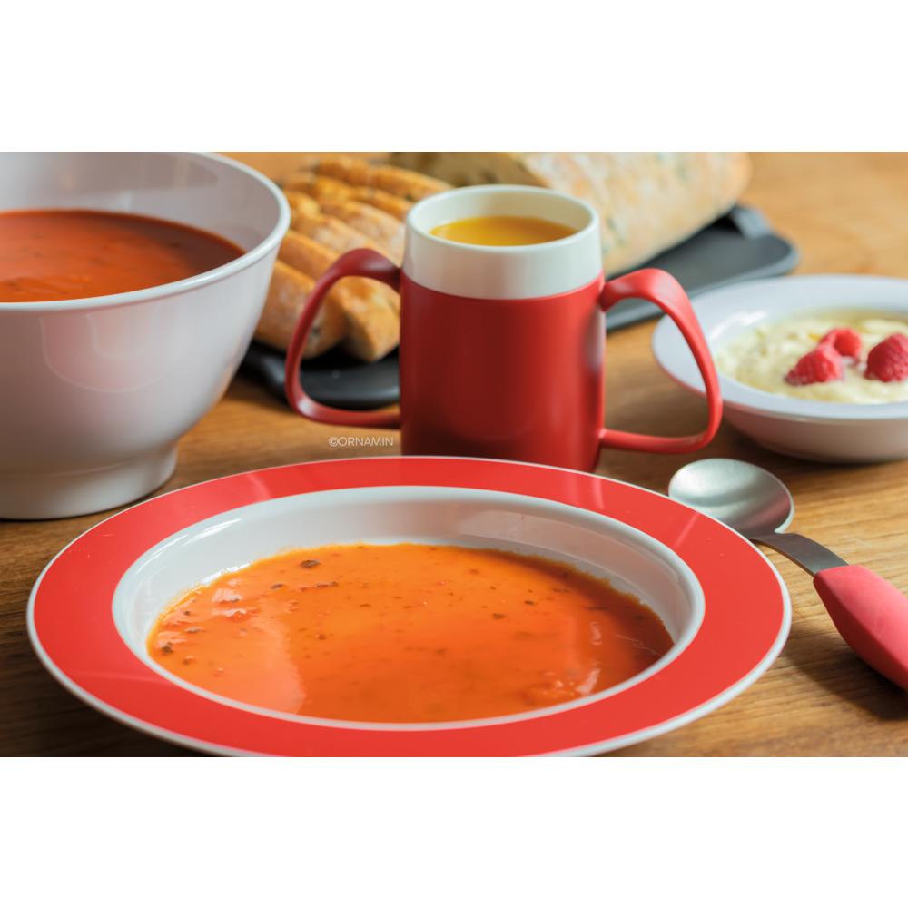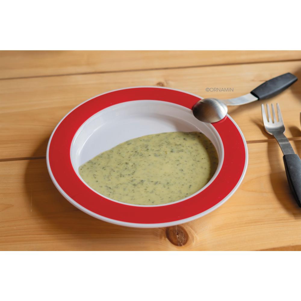 Der schräge Innenboden des Tellers und der Überhang am Rand erleichtern das selbstständige Essen. Der Antirutsch-Ring am Boden bietet festen Halt und verhindert ein Kippen. Der innovative Teller versteckt hinter seinem ansprechenden Äußeren besondere Funktionen: Ein schräger Innenboden, ein unauffälliger Überhang und ein Antirutsch-Ring am Tellerboden sorgen in Summe dafür, dass das Essen leichter auf Gabel oder Löffel gelangt und der Teller nicht verrutscht. Der Teller vereint somit drei Produkte, denn er ist Teller, Tellerranderhöhung und Tischset Antirutsch in einem. Auch bei körperlichen Einschränkungen wird so ein selbstständiges Essen ermöglicht. Ganz im Sinne des Universal Design trägt der Teller zu einer gepflegten Tischkultur bei, in der sich jeder wohlfühlt und das Essen genießt. Aus spülmaschinenfestem und mikrowellenfestem SAN-Kunststoff. Lieferzeit ca. 1 Woche.