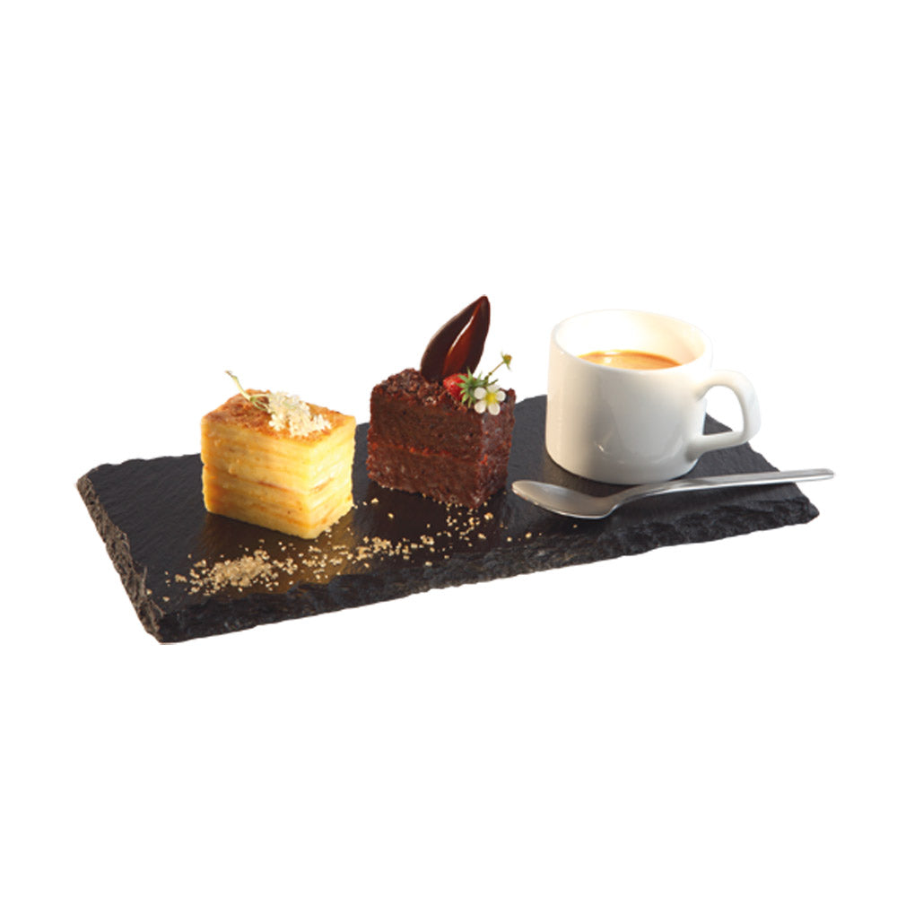 Lange Trägerplatte mit Stellringen (Ø 5,5 cm) zur Präsentation von Vorspeisen, Desserts und Snacks. Aus 7 mm starkem Naturschiefer mit gebrochenen Kanten, versiegelt mit lebensmittelechtem Speziallack.