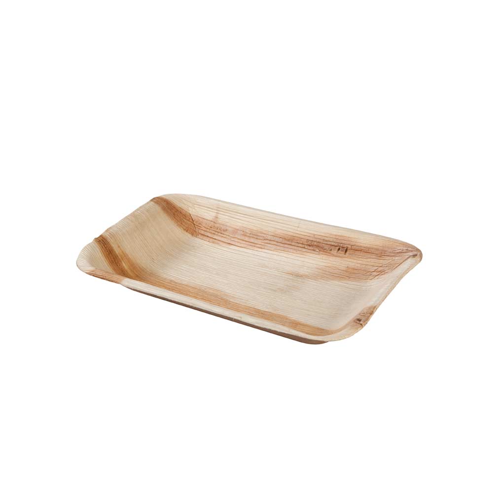 Palmblatt-Teller in rechteckiger, tiefer Ausführung mit den Maßen 25 x 15 x 2,5 cm. Nachhaltiges Einweggeschirr für Ihre natürlich guten Speisen. Preise inkl. Entsorgungsgebühr.