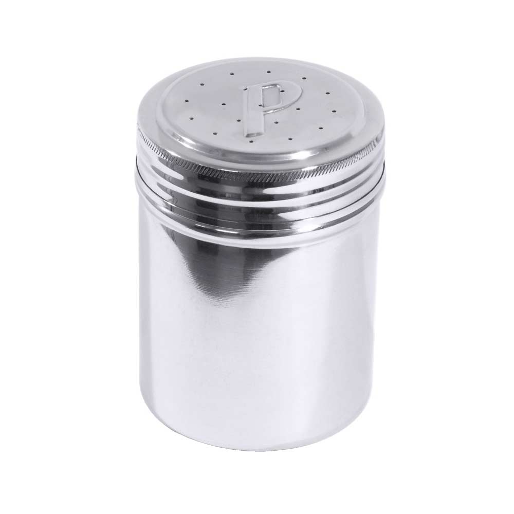 Pfefferstreuer aus Edelstahl. Mit praktischer Schraubkappe, hochglänzend, schwere Qualität. Der Pfefferstreuer hat einen Durchmesser von 7 cm und eine Höhe von 9 cm.