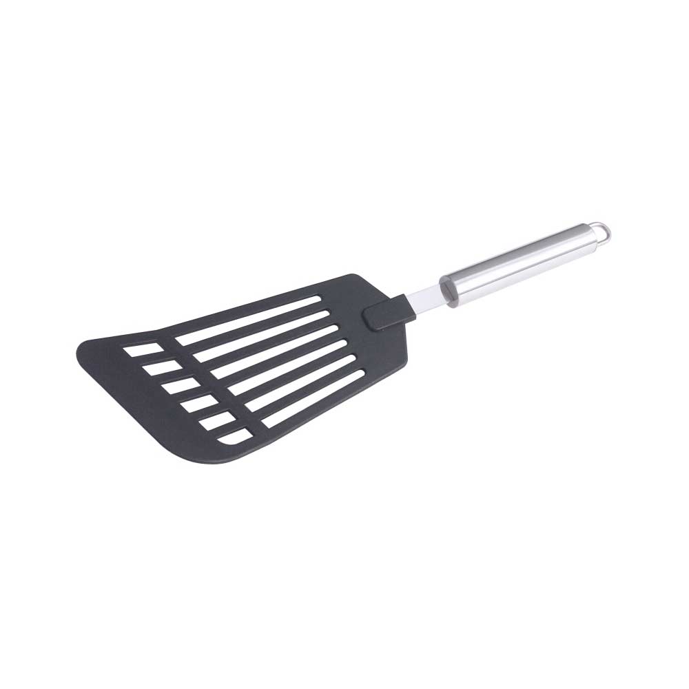 Hochwertiger Pfannenwender Polyamid in schwerer, robuster Qualität. Seidenmatt poliere Hohlgriffe aus rostfreiem Chromnickelstahl 18/10 mit robusten Aufhänge-Ösen. Spülmaschinenfest undmit einer Spatelgröße von 17 x 8 cm.