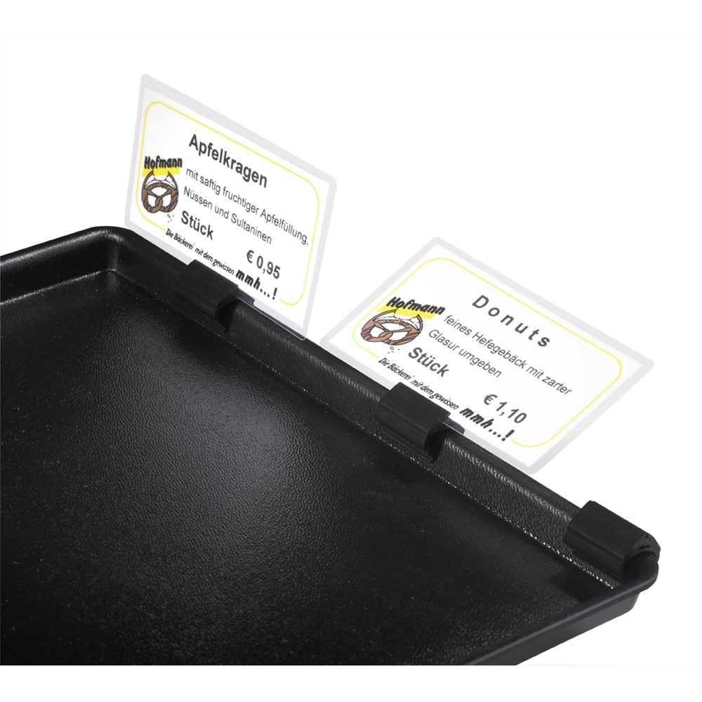 Universelle Preisschildhalter für Auslegetabletts "Premium" (Nr. 61 532). Größe 2,5 x 2 x 1,7 cm.