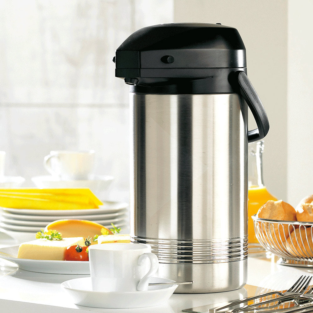 Inhalt 3 Liter - für ca. 24 Tassen. Druckknopfbedienung mit Transportsicherung. Hubmenge ca. 15 cl. Komplett abnehmbarer Deckel zum bequemen Füllen und Reinigen. Füllhöhe 30 cm - passend unter viele Vollautomaten. Stabiler, klappbarer Tragegriff. Unzerbrechlicher Korpus aus hochglänzendem, doppelwandigem Chromnickelstahl 18/10. Ø 15,5 x 36 cm. 5 Jahre Garantie auf die Isolierleistung!