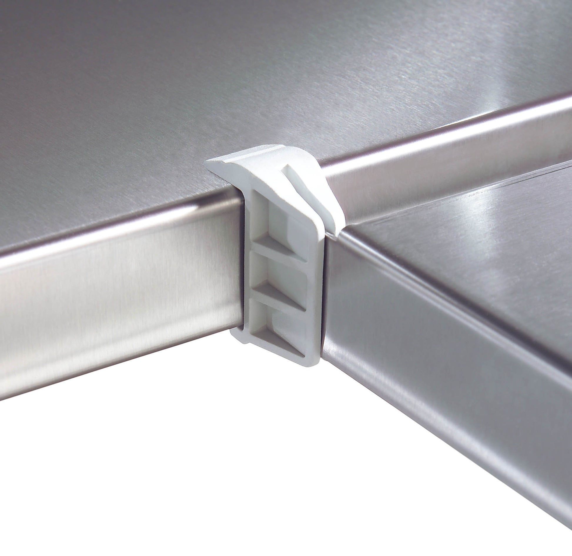 Die PREMIUM-RACK Eckverbindungsklammern ermöglichen eine stabile und offene Regalkonstruktion über Eck ideal für L- oder U-förmige Aufbauten in Lager, Küche oder Kühlraum. Zur Befestigung eines Bodens oder Rostes werden je Ecke zwei Klammern benötigt. Die hochwertige Verarbeitung sorgt für sicheren Halt und eine langlebige Verbindung im täglichen Einsatz.