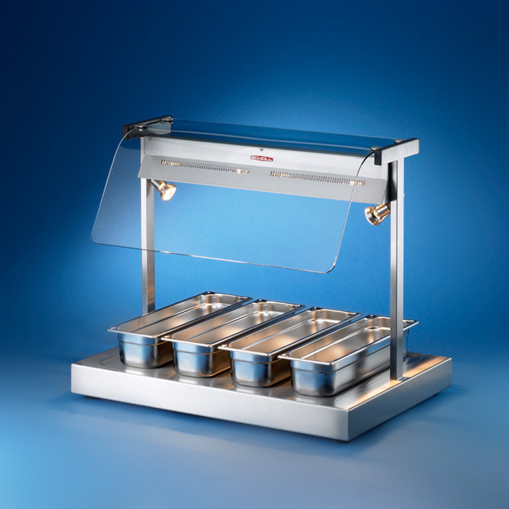 Hochwertige, beleuchtete Wärmebrücke mit Ober- und Unterhitze. Kompaktes Auftischgerät aus rostfreiem Edelstahl 18/10, mit abnehmbarer Hygieneschutzhaube (Hustenschutz) aus Sicherheitsglas.