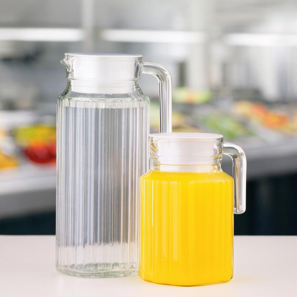 Schwere, ungeeichte Krüge aus klarem, spülmaschinenfestem Glas. Auch für Heißgetränke geeignet. Mit Klemmdeckel aus BPA-freiem Kunststoff. Platzsparende Form, perfekt passend für Kühlschranktüren. Extra stabiler, blauer Ersatzdeckel separat erhältlich.