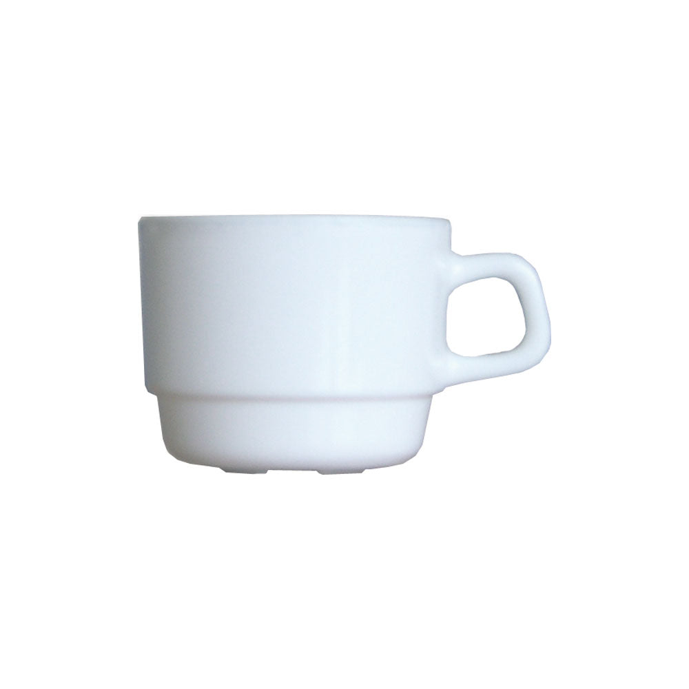 Reinweiße Kaffee-Obertasse aus Opalglas mit einem Inhalt von 19 cl. Durch die gerade Form ist die Tasse problemlos stapelbar.