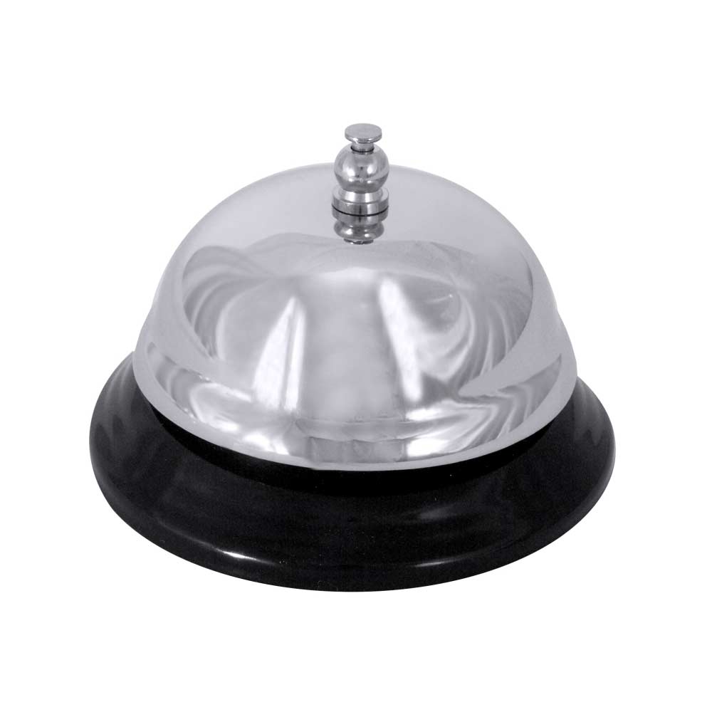 Hochglanzverchromte Rezeptionsglocke mit schwarz lackiertem Metallfuß. Die Glocke selbst ist verchromt und hat einen Gesamtdurchmesser von 8,5 cm. Die Gesamthöhe ist 6 cm.