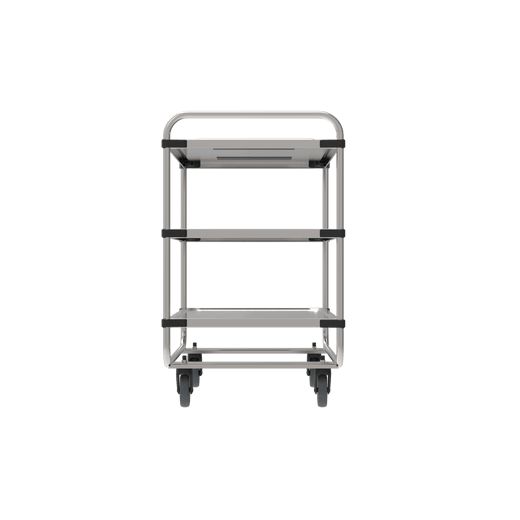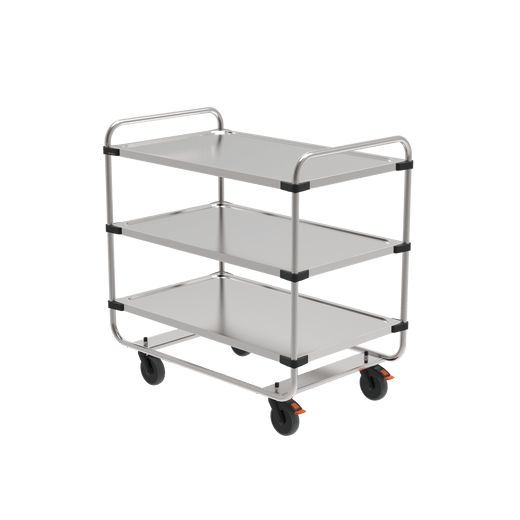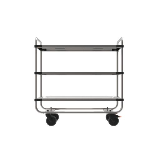 Hochqualitative und robuste Servierwagen aus Chromnickelstahl 18/10, Rundrohr-Schieberahmen mit eingeschweißten Traversen für die Rollenbefestigung. Tiefgezogene Borde mit Stopprand, schallgedämmt, innovative Schraubkonstruktion, max. Flächenbelastung pro Bord 80 kg. Rostfreie Rollen mit CN-Befestigung und Kugellager, Ø 12,5 cm. Die Servierwagen sind mit Stoßecken an jedem Bord und zwei Lenkrollen und zwei Lenkstopprollen ausgestattet. Wagen werden fertig montiert geliefert.