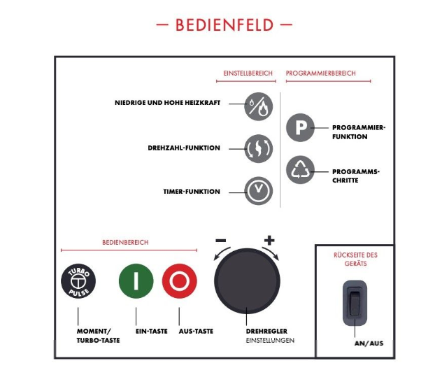 - Einfache Bedienung mit stufenloser Drehzahlregelung von 100 bis 3.500, im Turbo-Betrieb sogar bis 4.500 U/min.