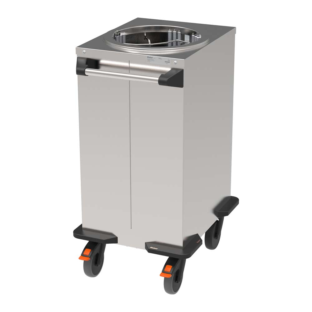 Unbeheizter Röhrenstapler für das Zwischenlagern und Transportieren von Rundgeschirr in einer herausnehmbarer, einfach zu reinigenden Verstellröhre (Durchmesser von Ø 19-32 cm). Unkompliziert und flexibel von Hand einstellbar durch drei Verstellstangen für die gewünschte Tellergröße, sowie gleichbleibend einstellbarer Ausgabehöhe, mit Zugfedern entsprechend dem Geschirrgewicht. Mit stabiler, leichtgängig geführter Plattform, kipp- und verkantsicher, mit robustem Abstapelmechanismus. Sicherheitsschiebegriff, 4 Stoßecken, rostfreie Rollen (2 Lenk- & 2 Lenkstopprollen).
