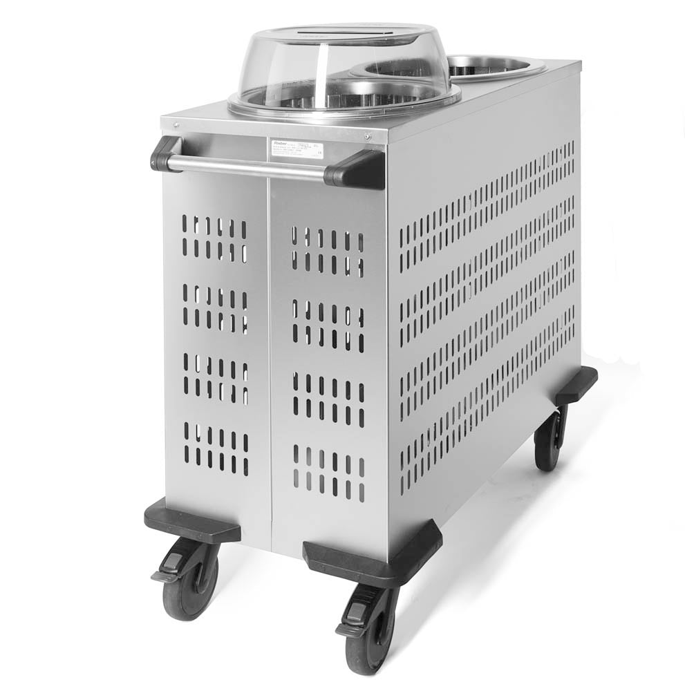 Unbeheizter Röhrenstapler mit Lüftungsschlitzen zum Vorkühlen für das Zwischenlagern und Transportieren von Rundgeschirr in zwei herausnehmbaren, einfach zu reinigenden Verstellröhren (Durchmesser von Ø 19-32 cm). Unkompliziert und flexibel von Hand einstellbar durch drei Verstellstangen für die gewünschte Tellergröße, sowie gleichbleibend einstellbarer Ausgabehöhe, mit Zugfedern entsprechend dem Geschirrgewicht. Mit stabiler, leichtgängig geführter Plattform, kipp- und verkantsicher, mit robustem Abstapelmechanismus. Sicherheitsschiebegriff, 4 Stoßecken, rostfreie Rollen (2 Lenk- & 2 Lenkstopprollen).