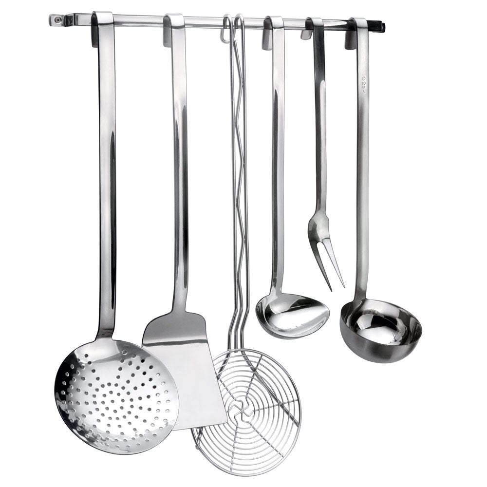 Schwere Qualität aus rostfreiem Chromnickelstahl 18/8 - 18/10. Alle Teile fugenlos gefertigt, mit gebogenem Ende zum Aufhängen. Schaumlöffel und Schöpfkellen mit Maßstempelung, spülmaschinenfest.