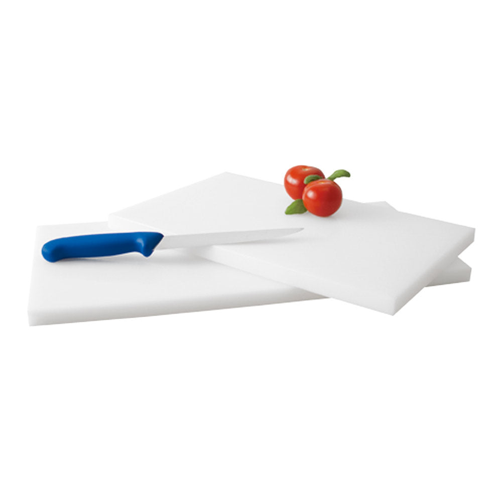 Hochwertige Qualität aus massivem, weißem PE-Kunststoff mit rutschfesten Füßen. Lebensmittelecht und spülmaschinengeeignet. Brettstärke 2 cm.