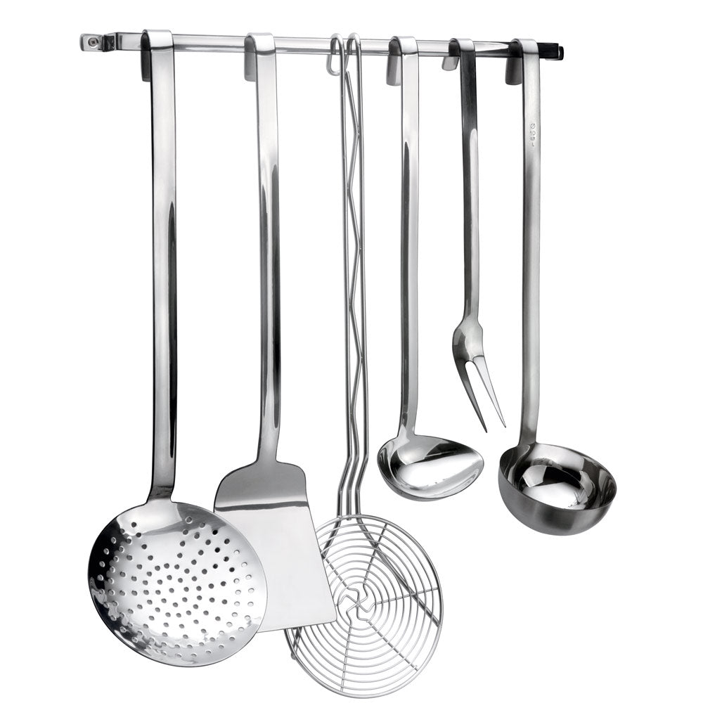 Schwere Qualität aus rostfreiem Chromnickelstahl 18/8 - 18/10. Alle Teile fugenlos gefertigt, mit gebogenem Ende zum Aufhängen. Schaumlöffel und Schöpfkellen mit Maßstempelung, spülmaschinenfest.