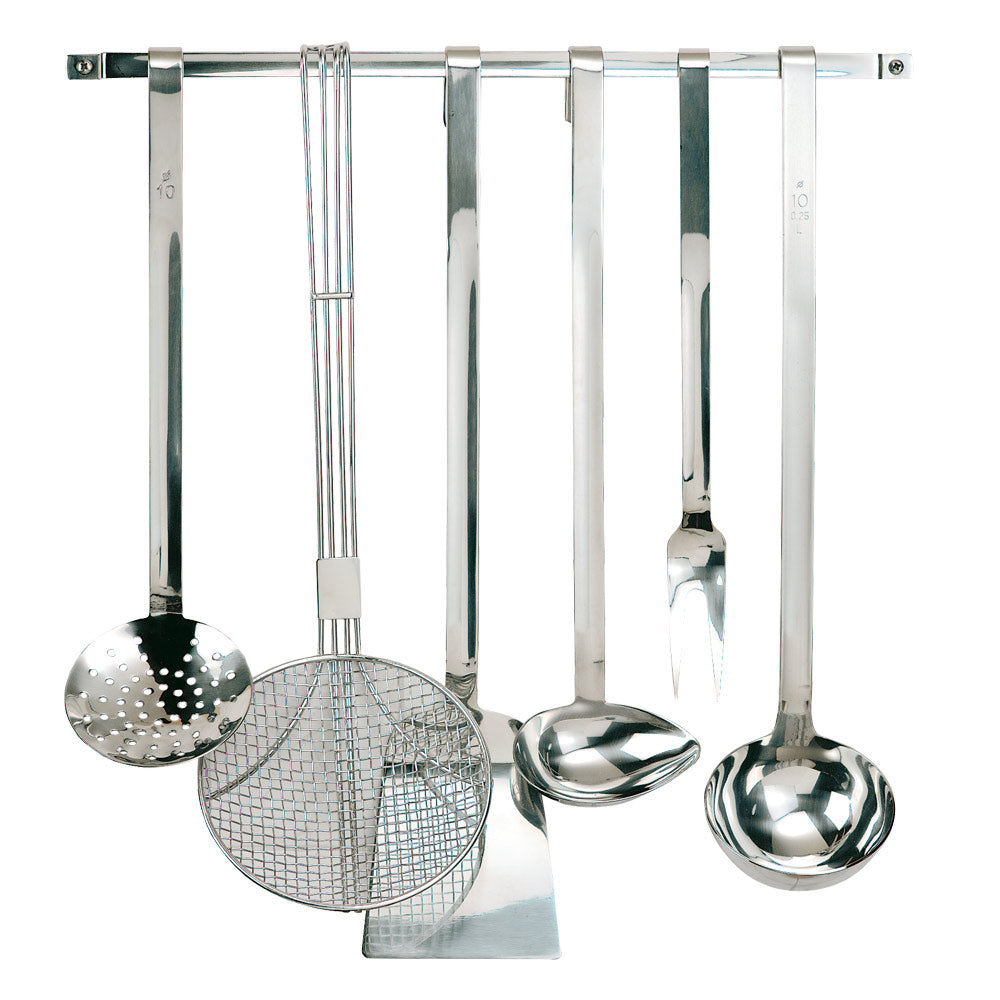 Schwere Qualität aus rostfreiem Chromnickelstahl 18/8 - 18/10. Alle Teile fugenlos gefertigt, mit gebogenem Ende zum Aufhängen. Schaumlöffel und Schöpfkellen mit Maßstempelung, spülmaschinenfest.