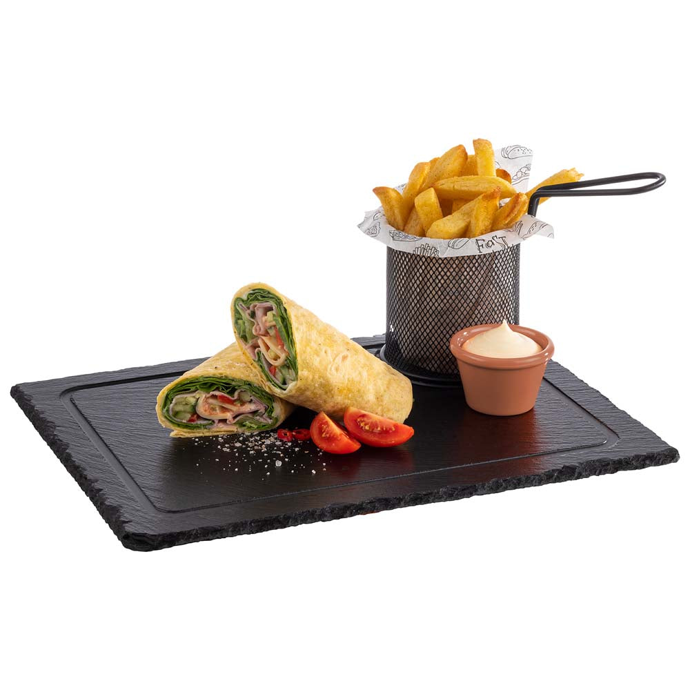 Servierplatte aus Naturschiefer, ideal zum Servieren von Menüs durch die Aussparung mit einem Durchmesser von 9,5 cm für Getränke. Nicht spülmaschinengeeignet.