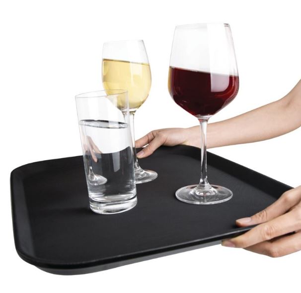 Bewährte Serviertabletts aus PP-Kunststoff. Die beschichtete Oberfläche ist im trockenen und nassen Zustand rutschfest.