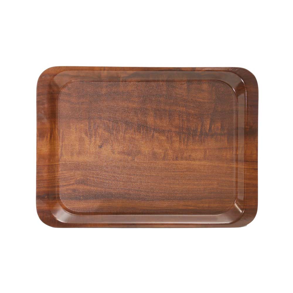Serviertablett aus melaminbeschichtetem 3 mm-Pressholz mit Nussbaum-Dekor, spülmaschinenfest (ausgenommen rutschfestes Tablett), schlagfest und bruchstabil, temperaturresistent von -10°C bis +100°C, säure-, laugen-, UV-beständig.