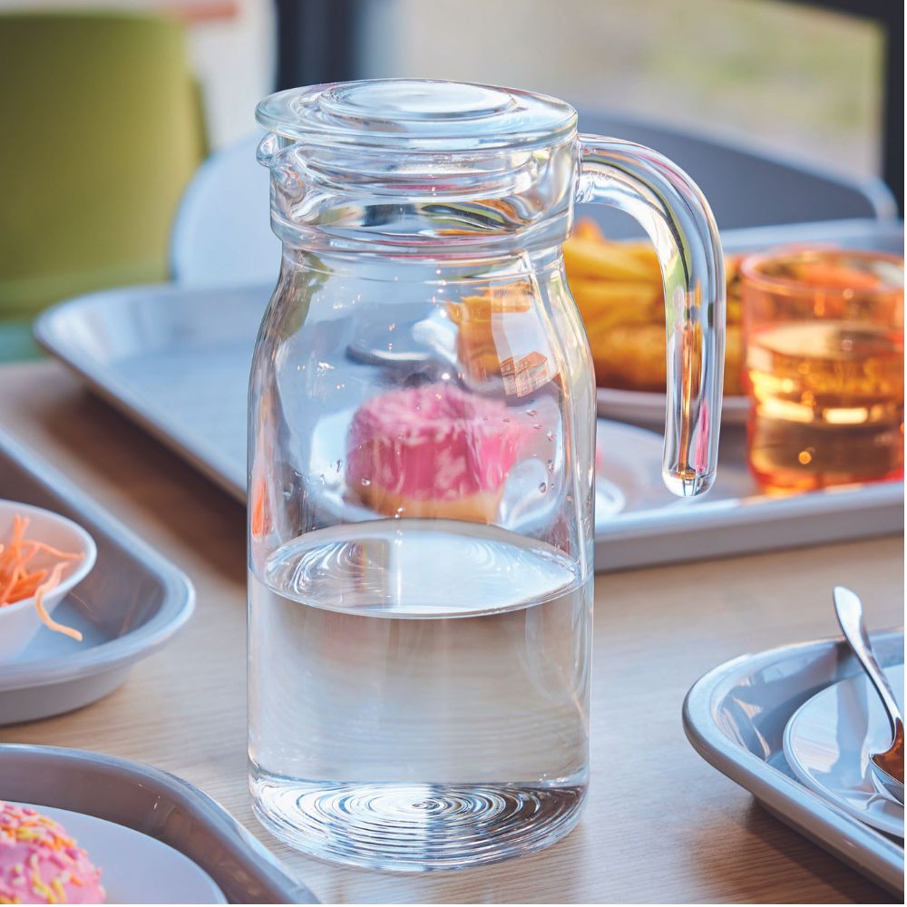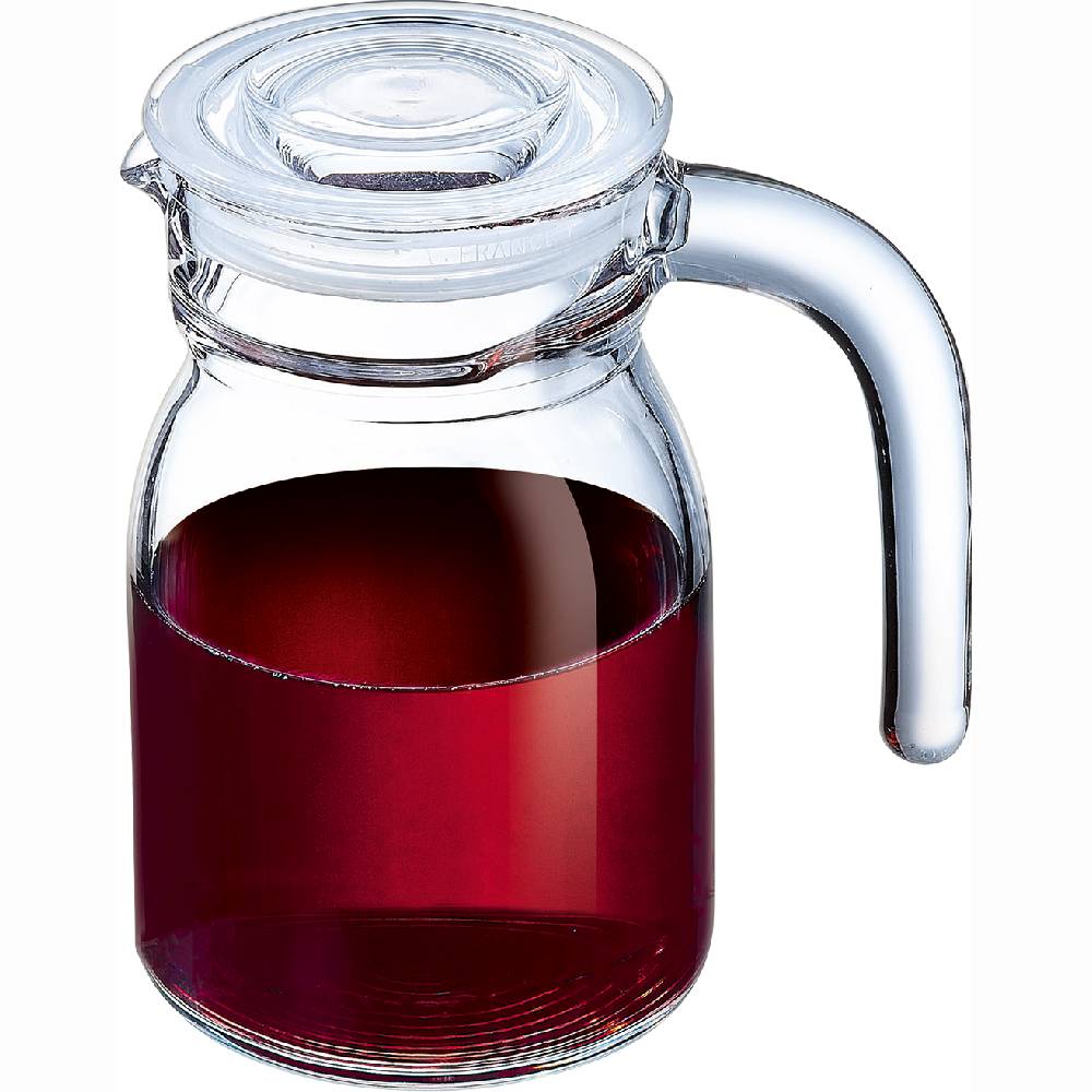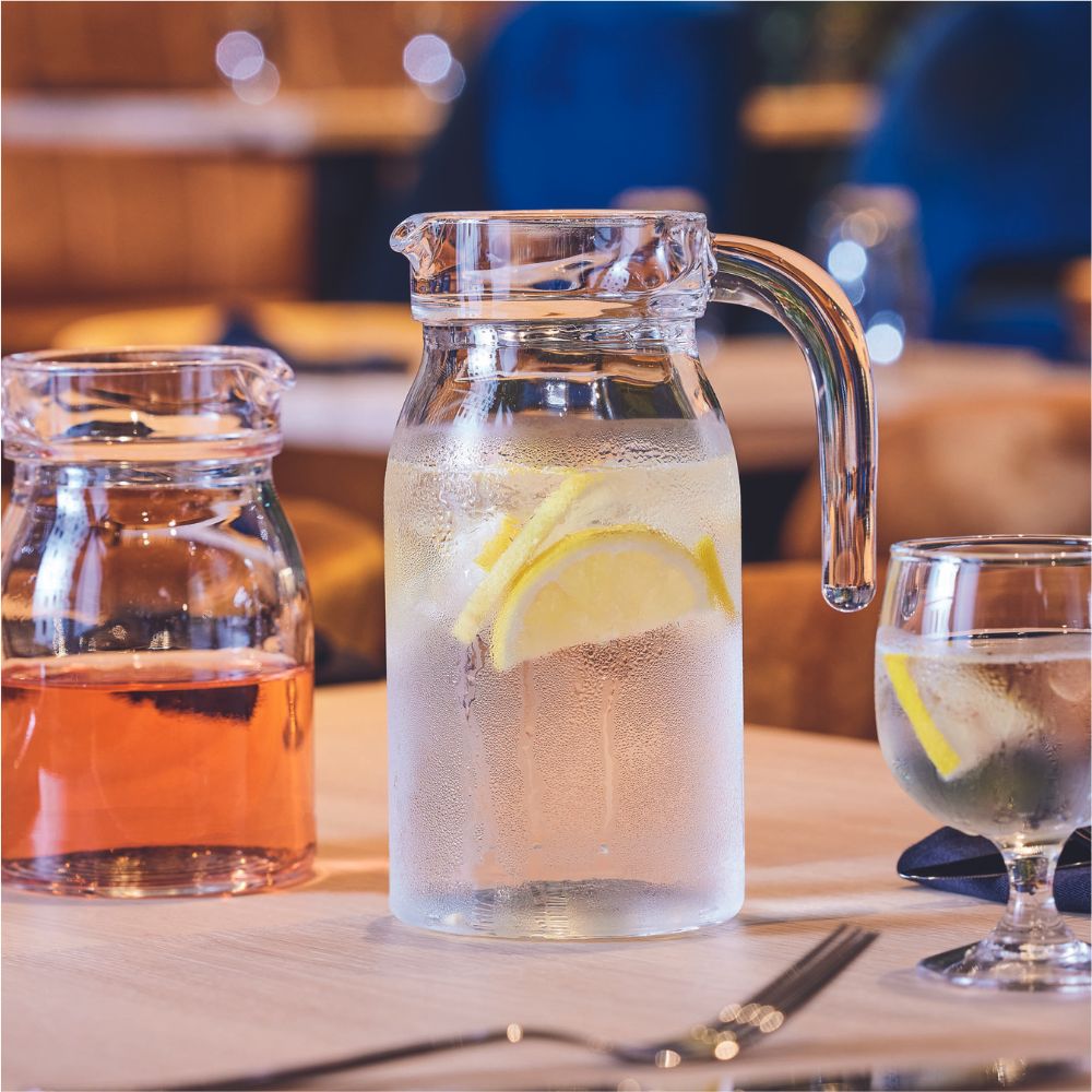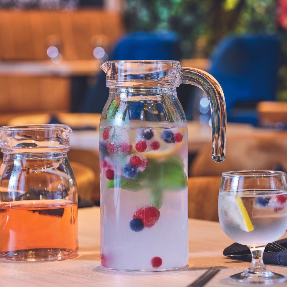 Formschöne Glaskrüge mit ergonomischem Griff für ein einfaches Servieren. Inklusive Glasdeckel für einen sicheren Verschluss und tropfffreies Ausgießen.