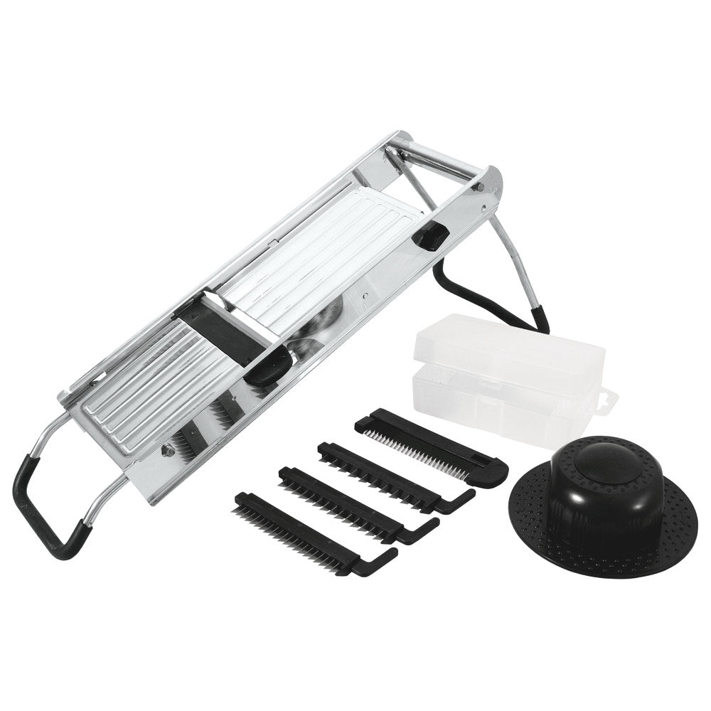 Solider, sehr preisgünstiger Gemüseschneider aus rostfreiem Chromnickelstahl 18/10. Schnittstärke verstellbar bis max. 15 mm. Lieferung mit glatter Klinge für Scheiben, gewellter Klinge für Waffel- und Wellenschnitte und drei Julienne-Messern für Stifte in 4, 6 und 10 mm Breite. Ausklappbare, rutschfeste Füße. Größe 40 x 12 x 20 cm. Komplett spülmaschinenfest.