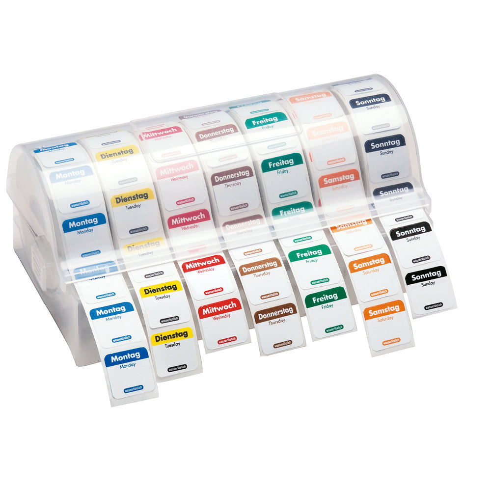 Bestehend aus einem Etiketten-Spender "Seven" mit einem vollständigen Satz Tages-Etiketten für jeden Wochentag (1.000 Etiketten pro Rolle und Tag). Lieferbar mit wiederablösbaren oder wasserlöslichen Etiketten. Ideal für alle Großverbraucher, die große Mengen kennzeichnen müssen. Wandbefestigung möglich. Lebensmittel, die aufbewahrt werden, müssen mit dem Zeitpunkt ihrer Herstellung markiert werden. Nur so lassen sich die Risiken des Verderbs mit allen ihren Folgen ausschließen. Unser HACCP-Kennzeichnungssystem unterstützt Sie ideal bei der Umsetzung der Lebensmittelhygiene-Verordnung. Hier hat jeder Herstellungstag seine eigene, individuelle Farbe. Und wird nichts anderes auf dem Etikett vermerkt, so beträgt die Haltbarkeit zwei Tage. Ganz einfach und schnell zu vermitteln. So ist allen Mitarbeitern auf den ersten Blick ersichtlich, welche Produkte zuerst verbraucht werden müssen. Und das spart viel Geld. Wiederablösbare Etiketten sind vor dem Spülen von glatten und trockenen Oberflächen ganz einfach und rückstandslos entfernbar. Einsatzbereich von -40° bis +70° C. Abwaschbare Etiketten lösen sich im Wasser ganz einfach von der Oberfläche ab, da sie mit wasserlöslichem Kleber versehen sind. Einsatzbereich von -40° bis +80° C. Wasserlösliche Etiketten sind aus kompostierbarem Material und lösen sich im Wasser vollständig auf. Sie sind damit ideal für die Etikettierung von Vorratsbehältern, die nach der Benutzung ohnehin in der Spülmaschine gereinigt werden. Einsatzbereich von -40° bis +80° C. Permanente Etiketten sind ideal für die Kennzeichnung von Einwegverpackungen. Einsatzbereich von -40° bis +70° C.