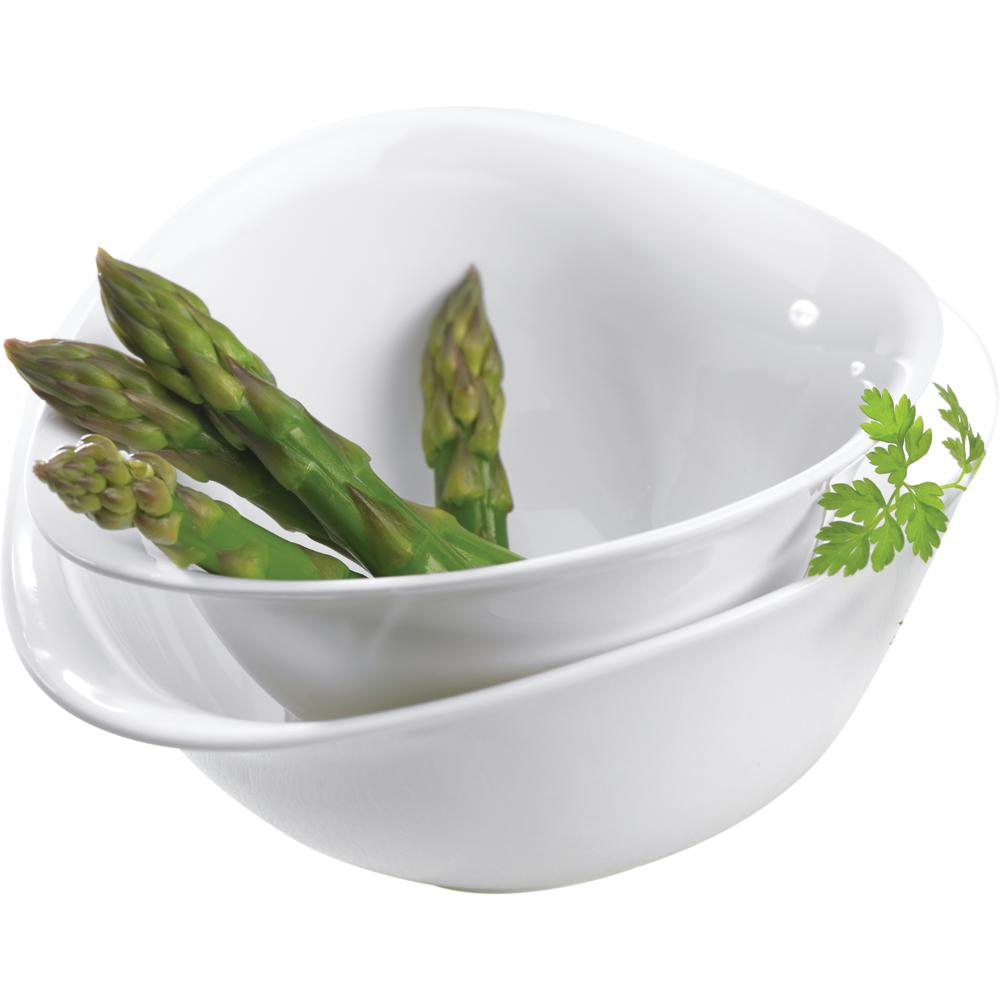 Die organisch-geschwungenen Schüsseln eignen sich hervorragend für feine Suppen und Desserts. In drei unterschiedlichen Größen - passend für jeden Einsatzbereich. Aus stapelfähigem, mikrowellen- und spülmaschinenfestem Hartporzellan in Hochweiß.