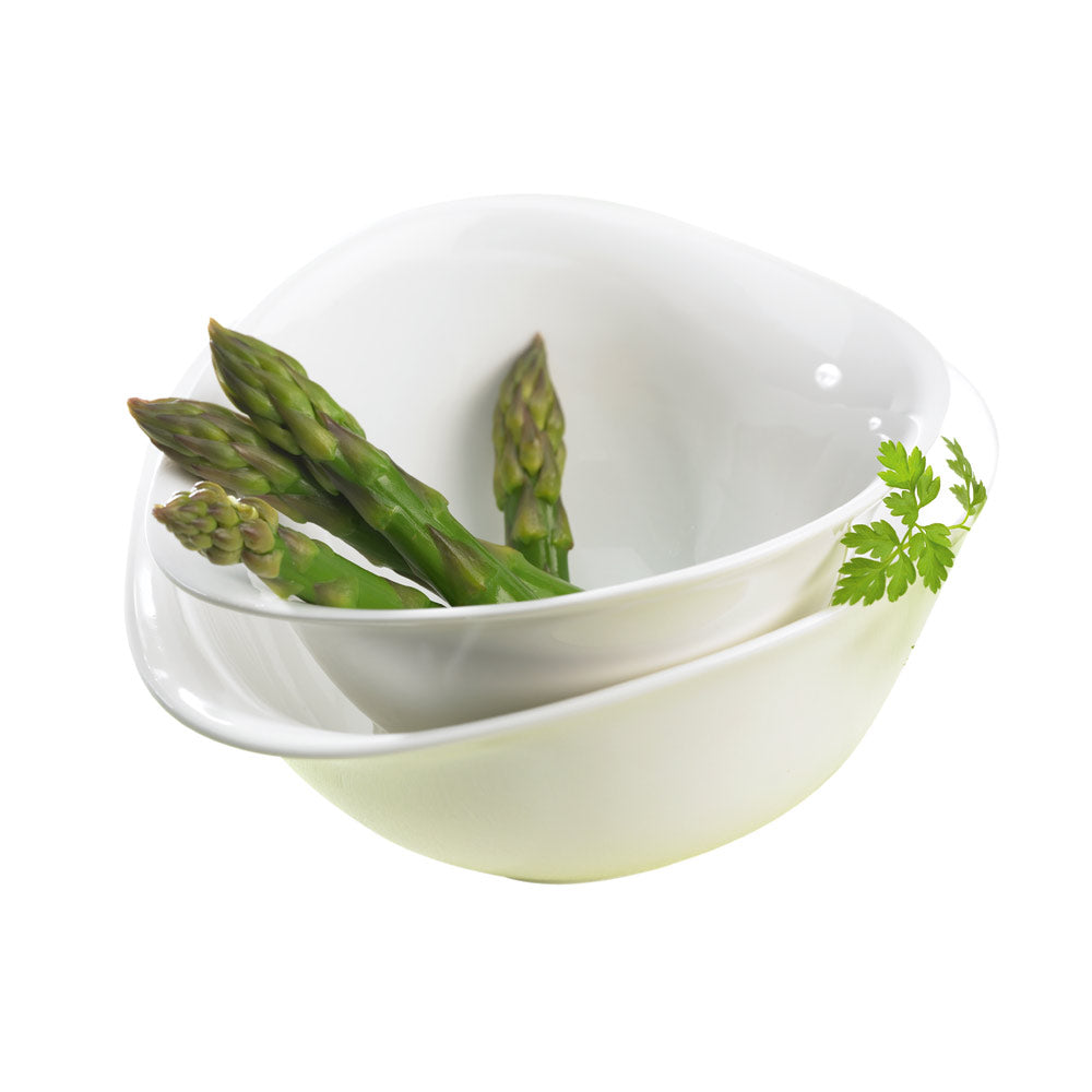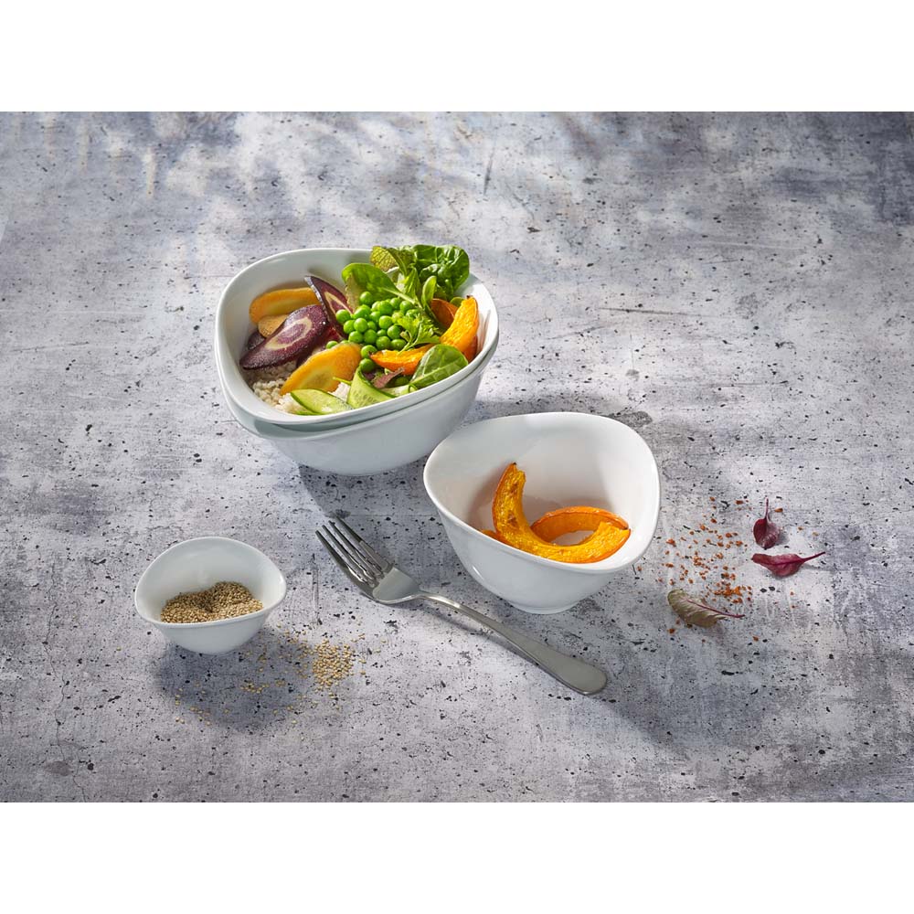 Die organisch-geschwungenen Schüsseln eignen sich hervorragend für feine Suppen und Desserts. In drei unterschiedlichen Größen - passend für jeden Einsatzbereich. Aus stapelfähigem, mikrowellen- und spülmaschinenfestem Hartporzellan in Hochweiß.