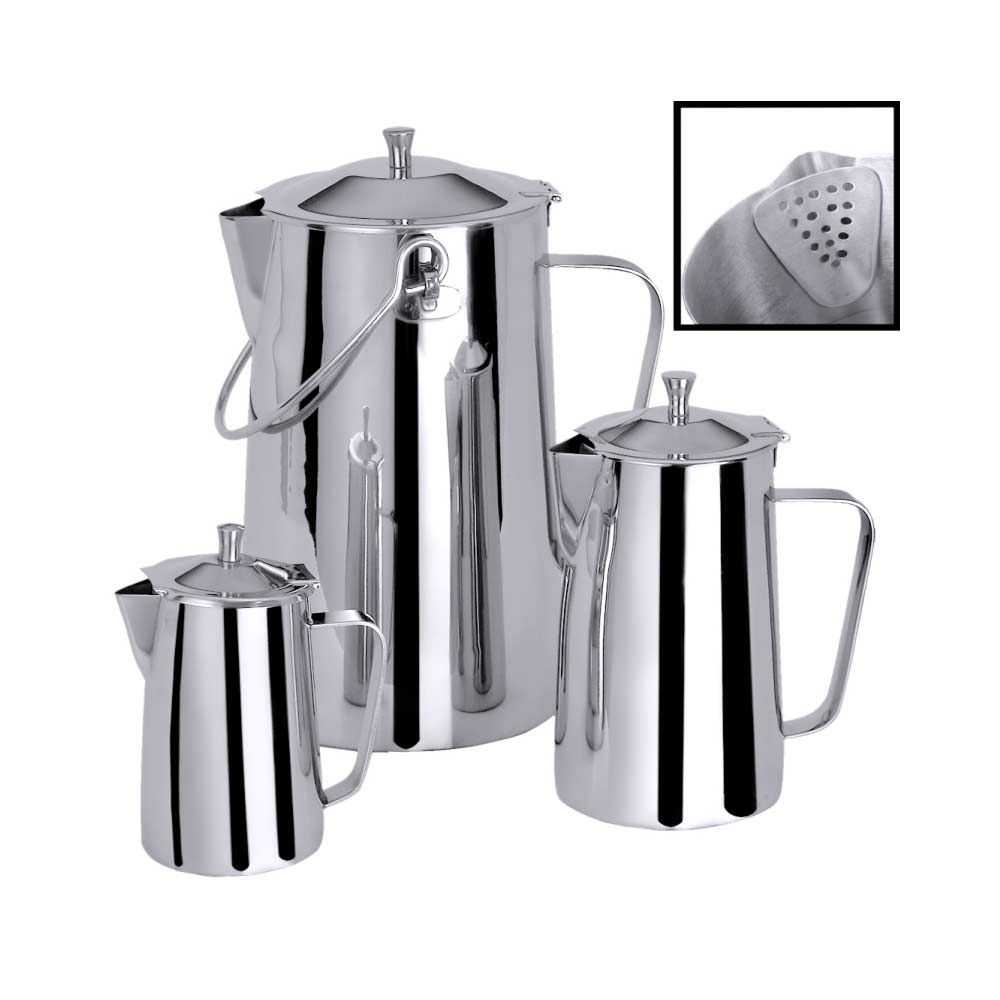 Teekanne aus Edelstahl 18/10, hochglänzend. Mit praktischem Scharnierdeckel und Innensieb. Die Griffe sind stumpf geschweißt und daher absolut hygienisch. Extra schwere Qualität. Die Teekanne hat ein Fassungsvermögen von 3 Litern und eine Höhe von 25 cm.