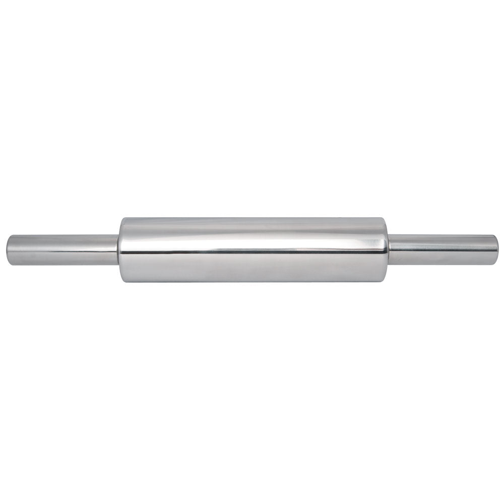 Robuste Teigrolle aus rostfreiem Edelstahl 18/10 - hochglanzpoliert. Mit kugelgelagerten Griffen. Walzen-Ø 6,5 x 25,5 cm - Gesamtbreite 47 cm.